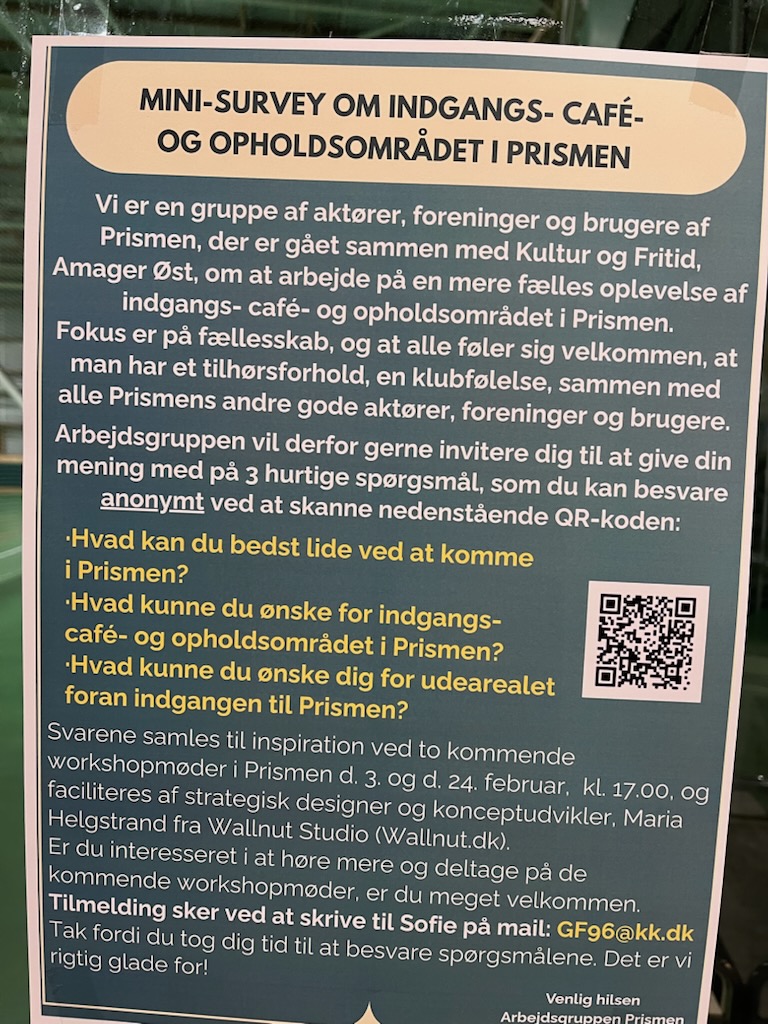 Amager Gators har nu en spændende mulighed for at få indflydelse på udformningen af Prismens opholdsområde i lobbyen samt ved og bag caféen – og her har vi brug for jeres hjælp.